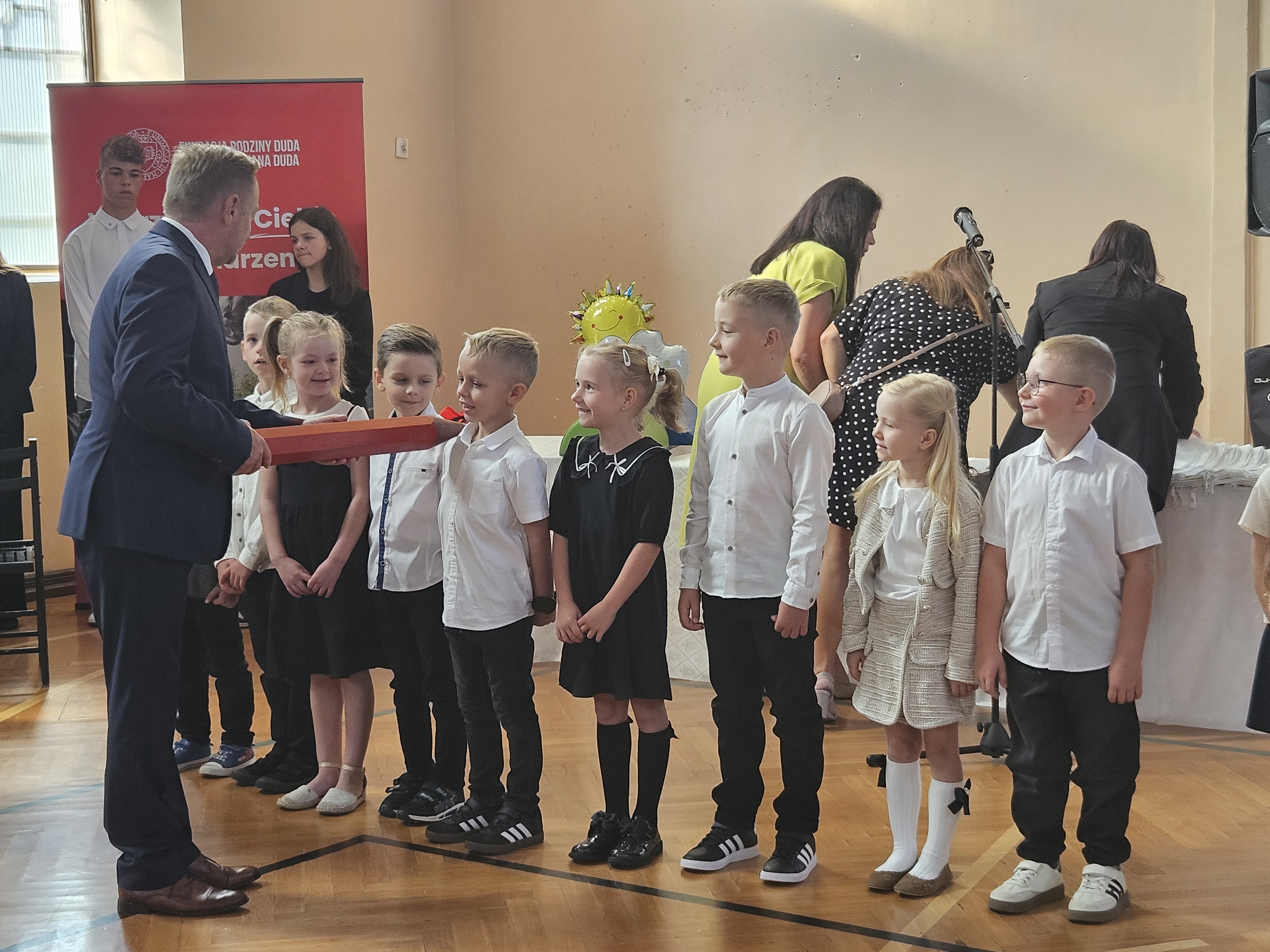 Dyrektor szkoły p. Waldemar Swornowski w szczególny sposób powitał uczniów klas pierwszych. Oni właśnie rozpoczynają swoją przygodę z nauką w Szkole Podstawowej w Jutrosinie. W tym dniu zostali oficjalnie przyjęci do grona uczniów. Odbyło się "ślubowanie" oraz "pasowanie na ucznia klasy pierwszej". Pierwszaki przyrzekali być dobrym i pilnym uczniem oraz wywiązywać się z obowiązków szkolnych.