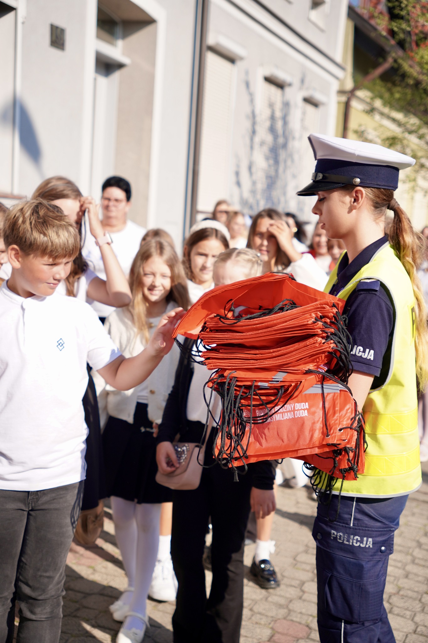 Dodatkową atrakcją, dzięki współpracy z Fundacja Rodziny DUDA im. Maksymiliana Duda były odwiedziny Sierżanta Pyrka wraz z policjantami z Komendy Powiatowej Policji w Rawiczu, który zadbał o wyposażenie naszych uczniów w odblaski oraz worki, które widoczne będą dla każdego kierowcy.